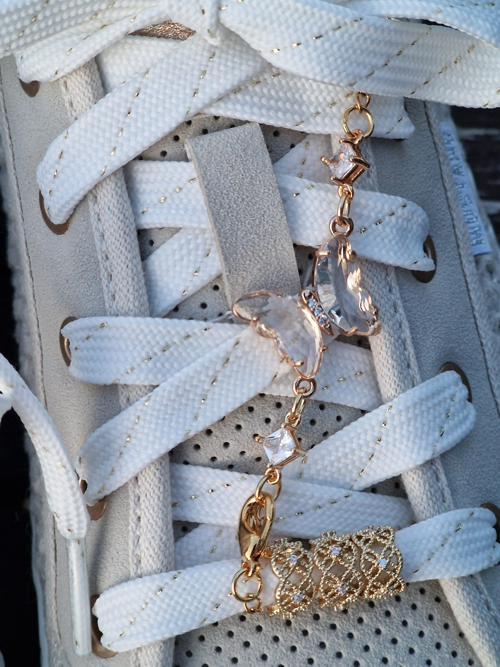 Bijou délicat composé d’un papillon en strass blanc encadré de deux strass carrés, suspendu à une chaînette dorée — présenté ici sur une basket Mustang.