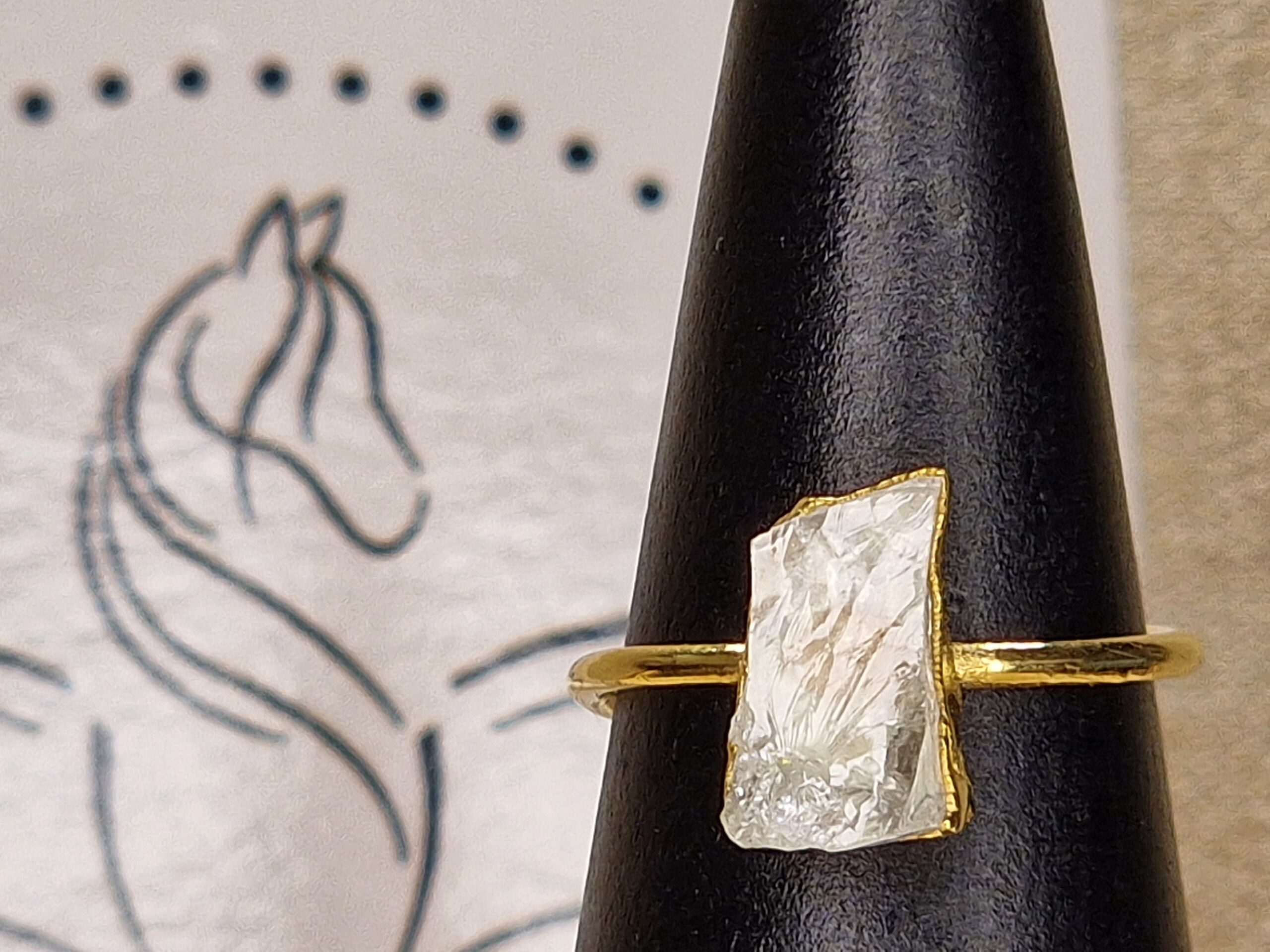Bague ajustable en argent 925 doré à l’or fin, ornée d’une pierre drusy de cristal de roche aux reflets translucides. Un bijou lumineux à l’élégance pure.