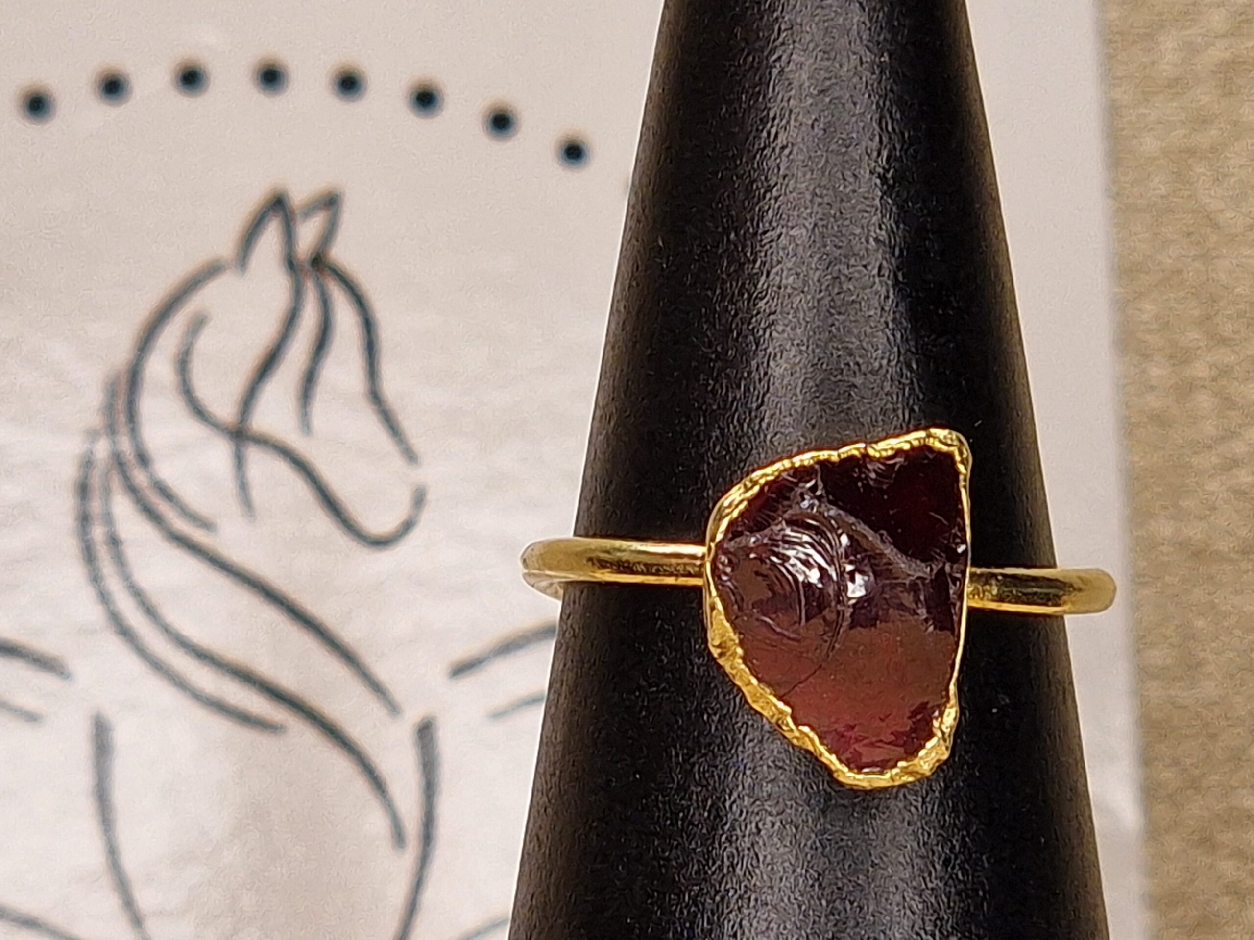 Bague ajustable en argent 925 doré à l’or fin, ornée d’une pierre Druzy de Grenat aux reflets rouges profonds. Un bijou vibrant à l’élégance affirmée.