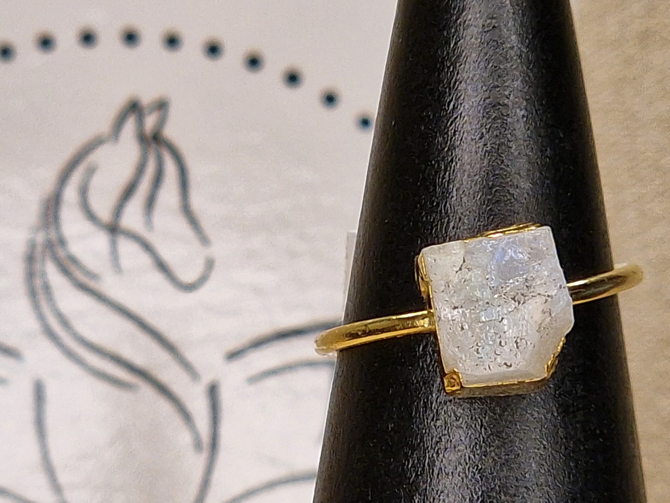 Bague ajustable en argent 925 doré à l’or fin, ornée d’une pierre drusy de pierre de lune aux reflets irisés. Un bijou poétique à l’éclat céleste.
