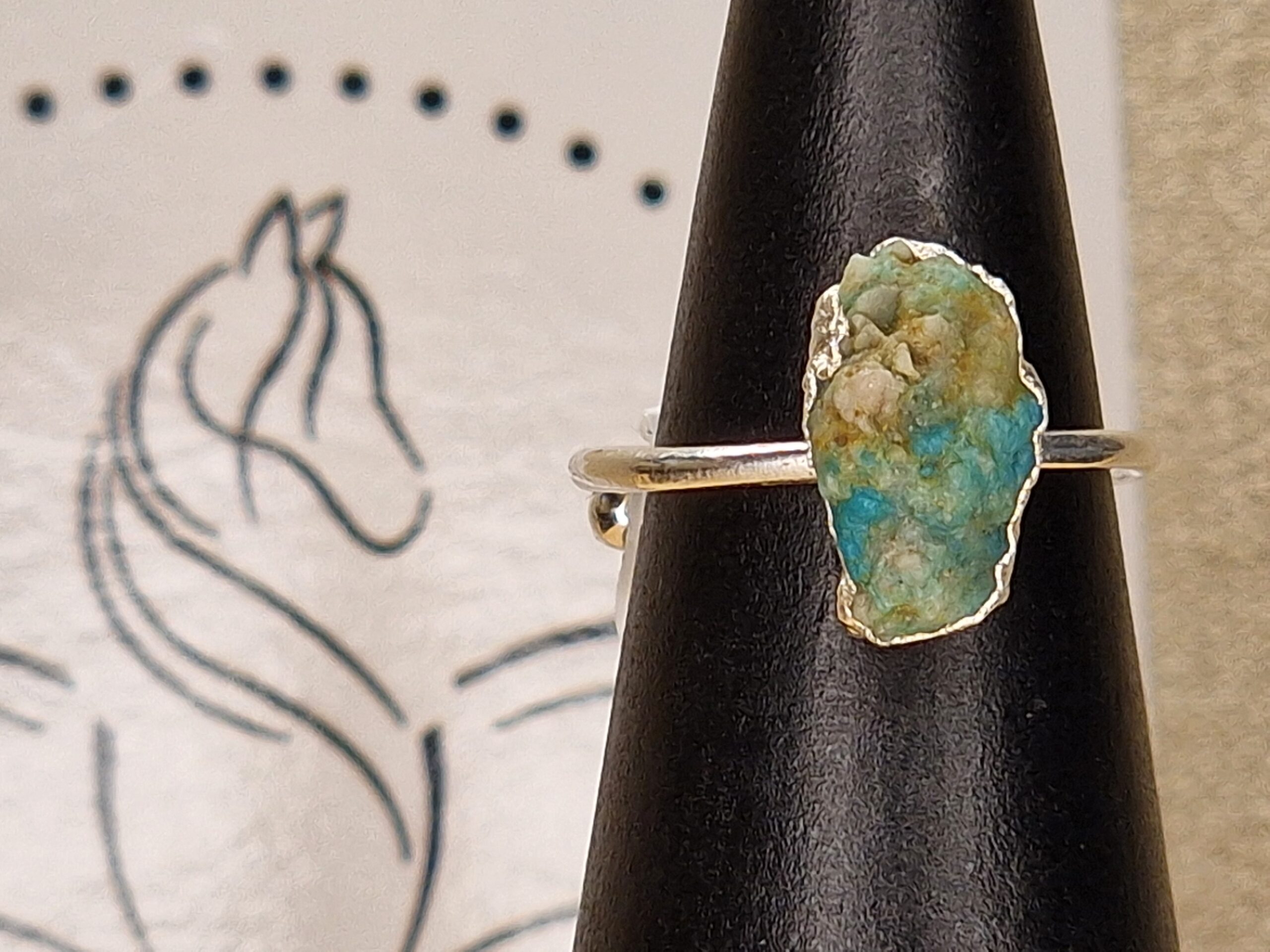 Bague ajustable en argent 925, ornée d’une pierre drusy turquoise aux reflets vibrants. Un bijou lumineux au style naturel et raffiné.