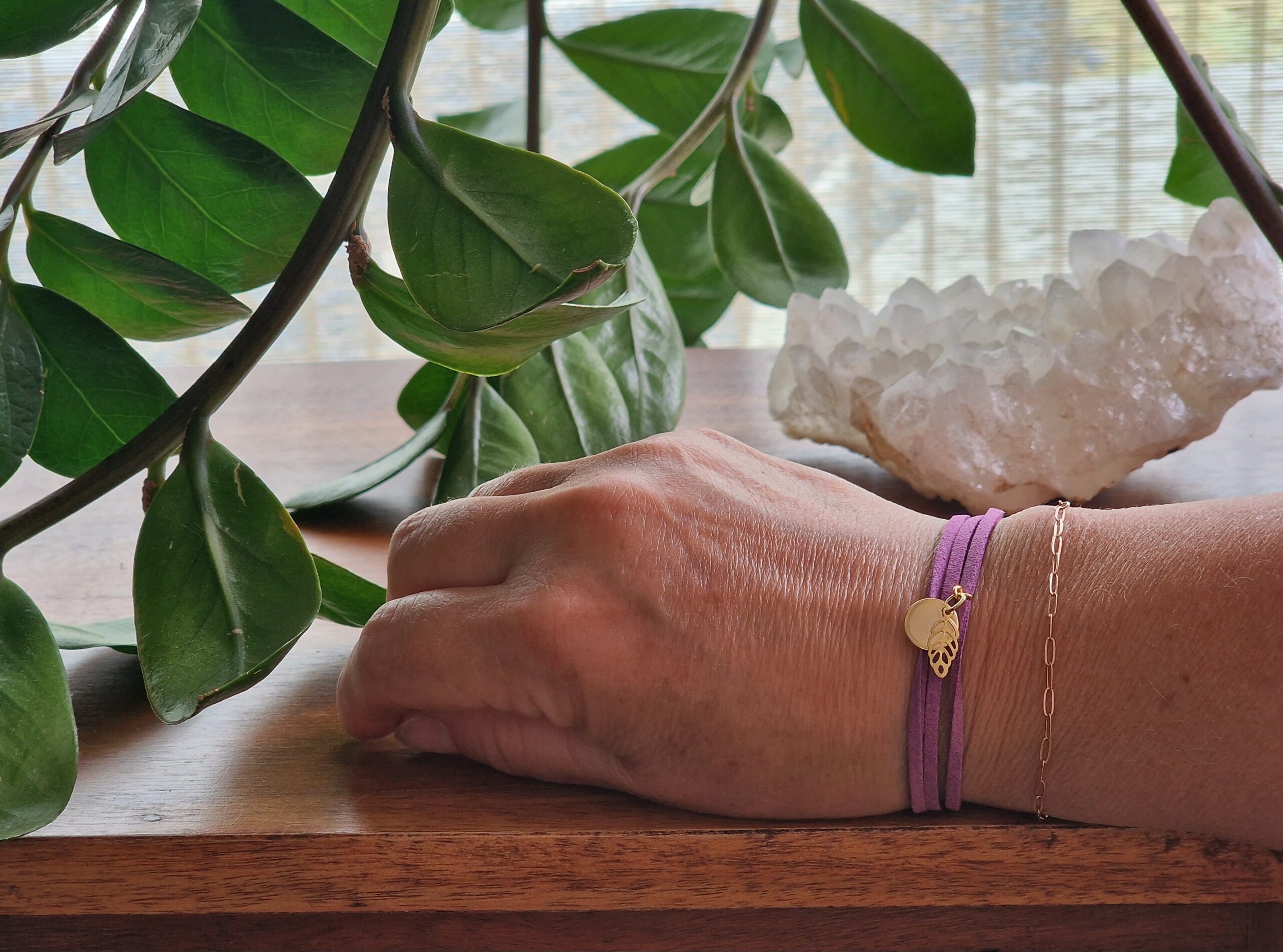 Triple tour en faux daim mauve avec pastille ronde et feuille ajourée dorées. Décliné en 15 teintes pour accessoiriser tous les styles avec finesse et douceur.