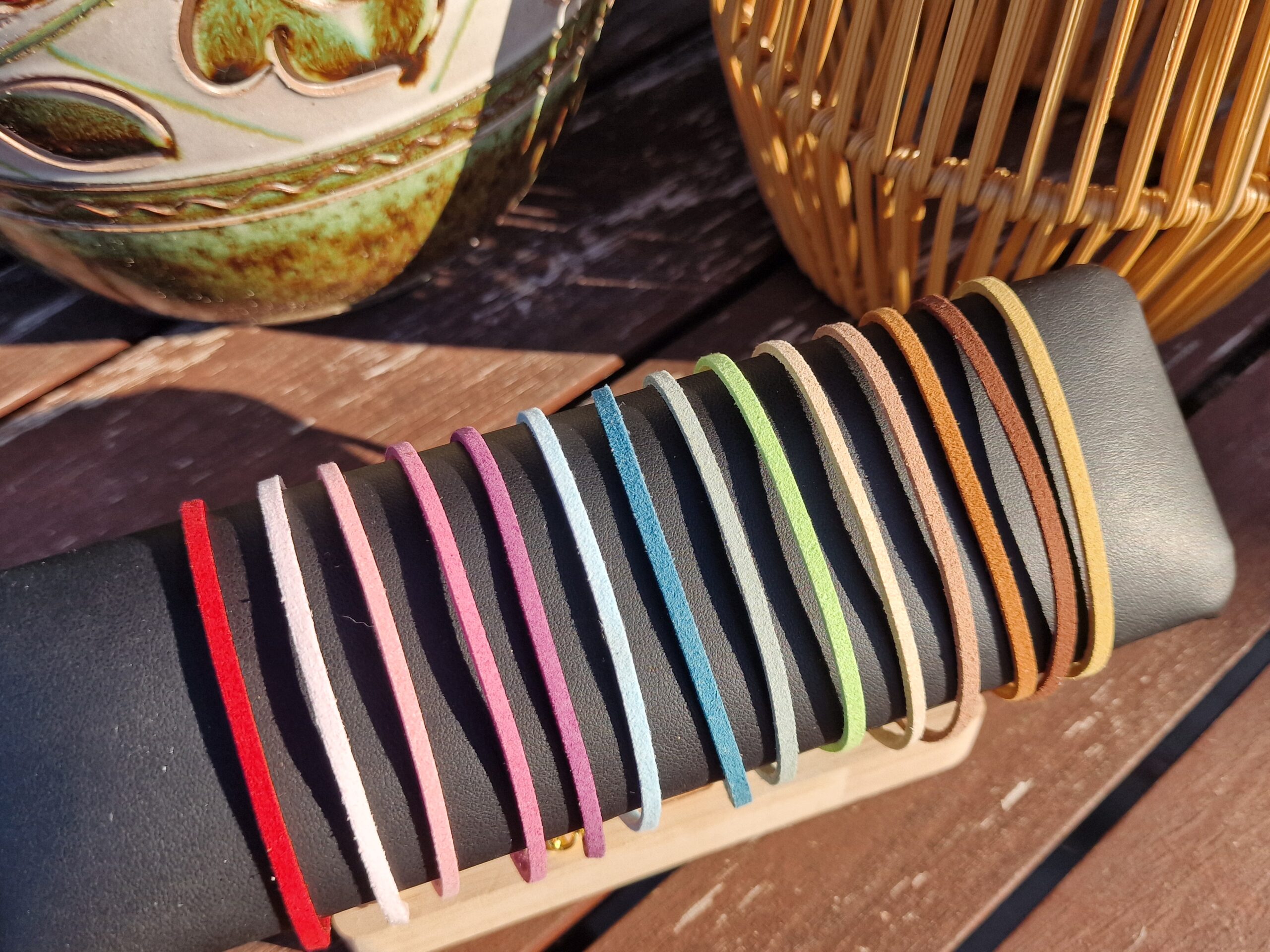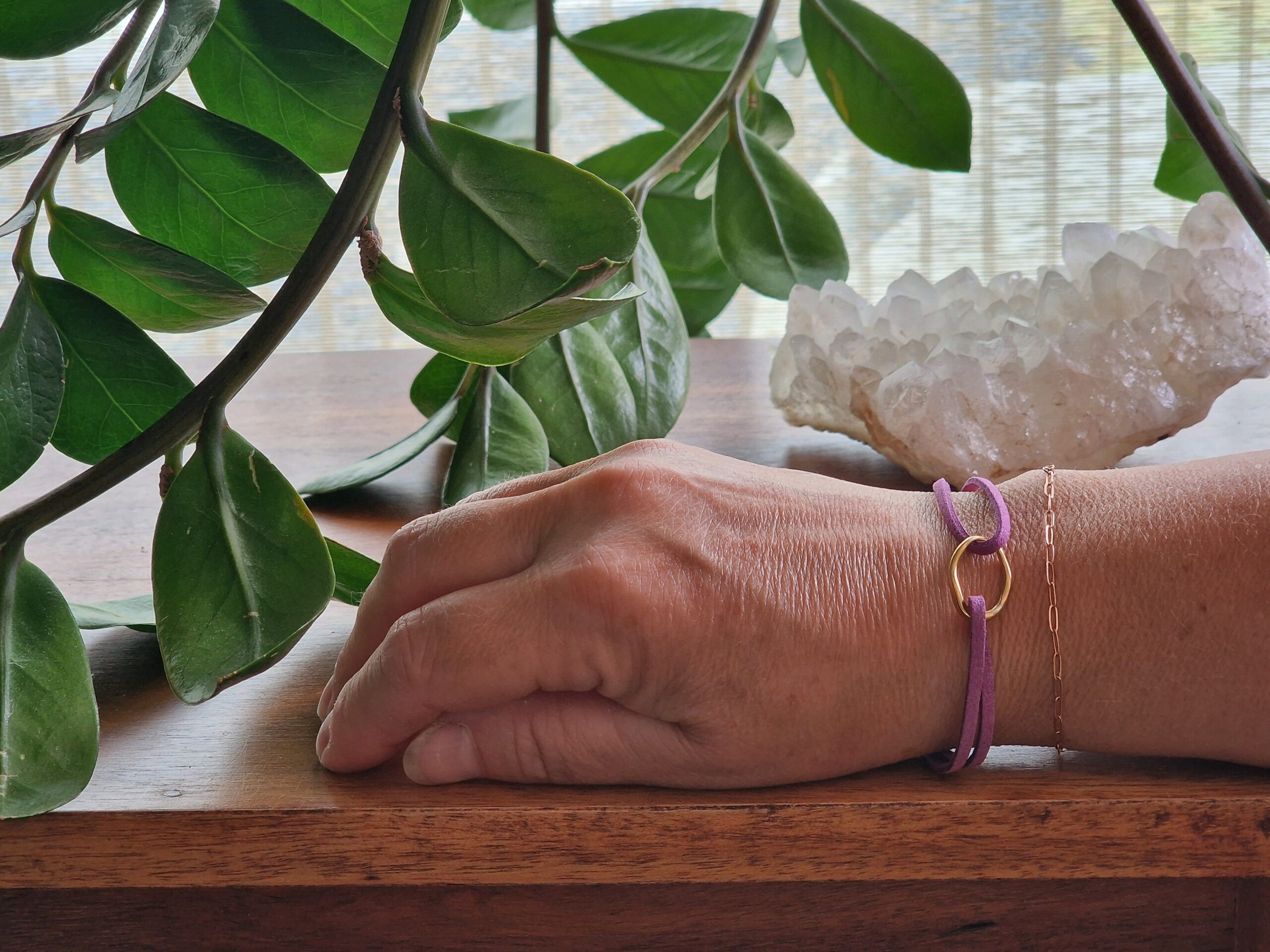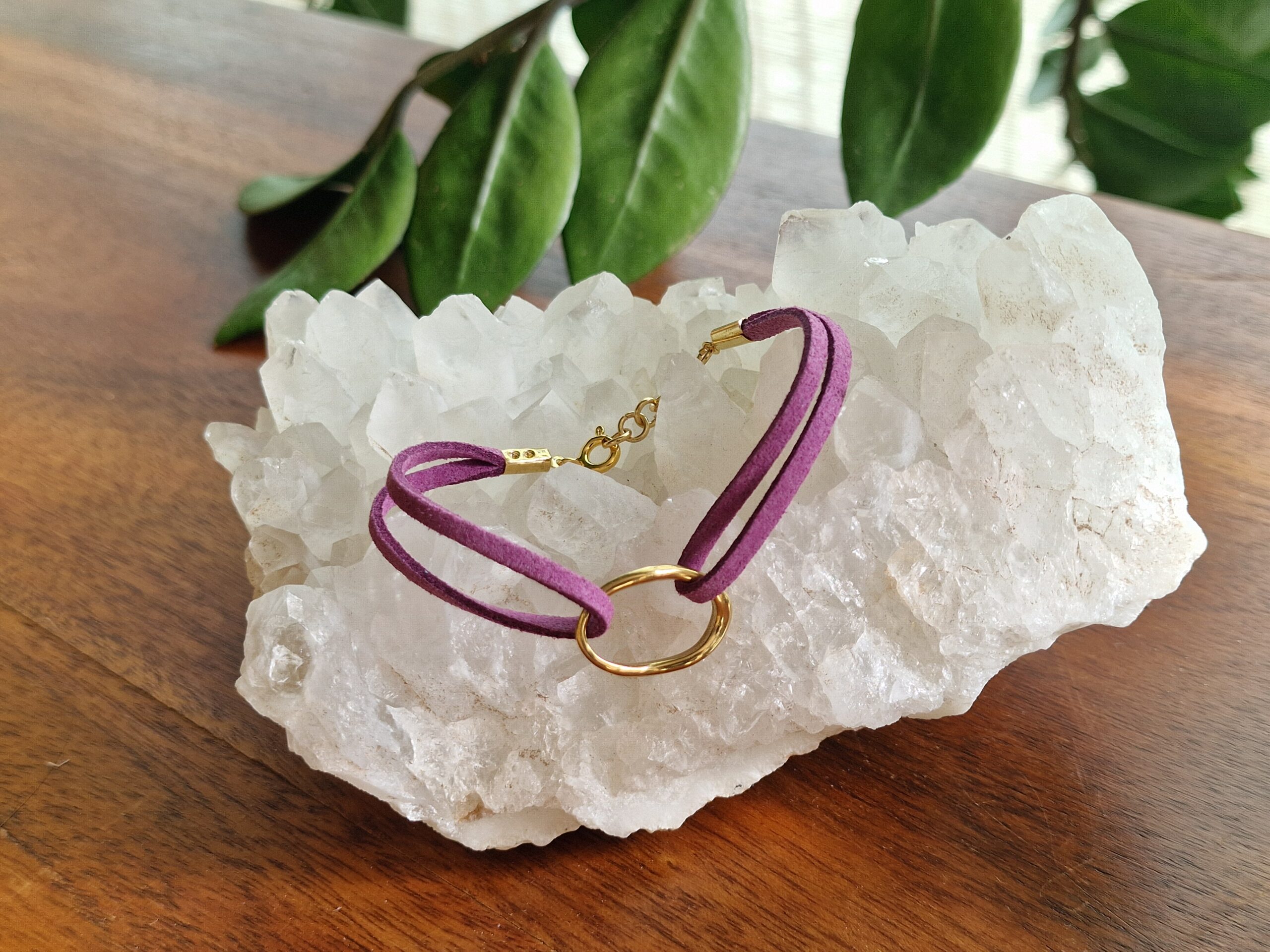 Bracelet lacet faux daim mauve avec Breloque Ovale dorée, plaqué flash or 18K.
