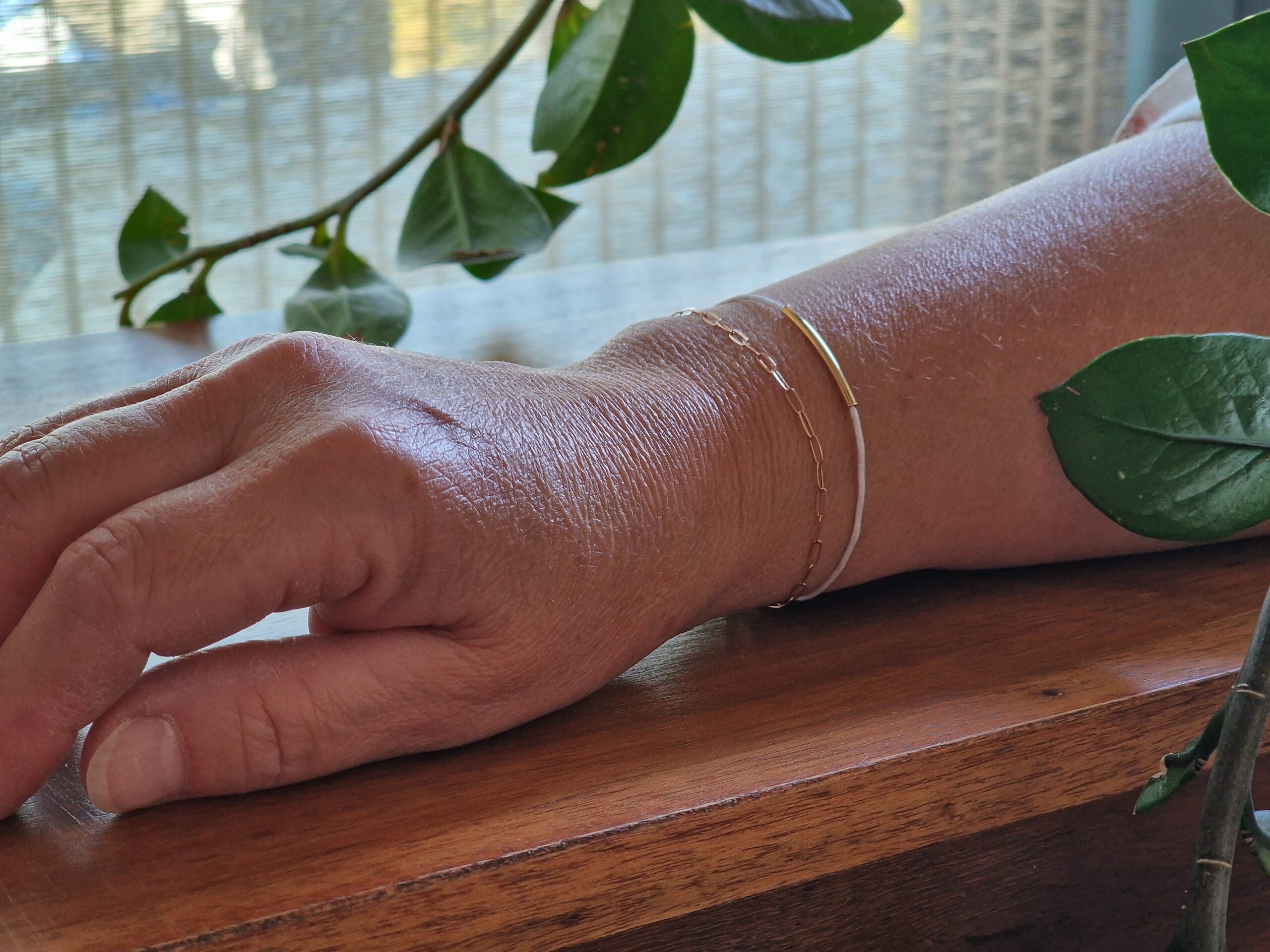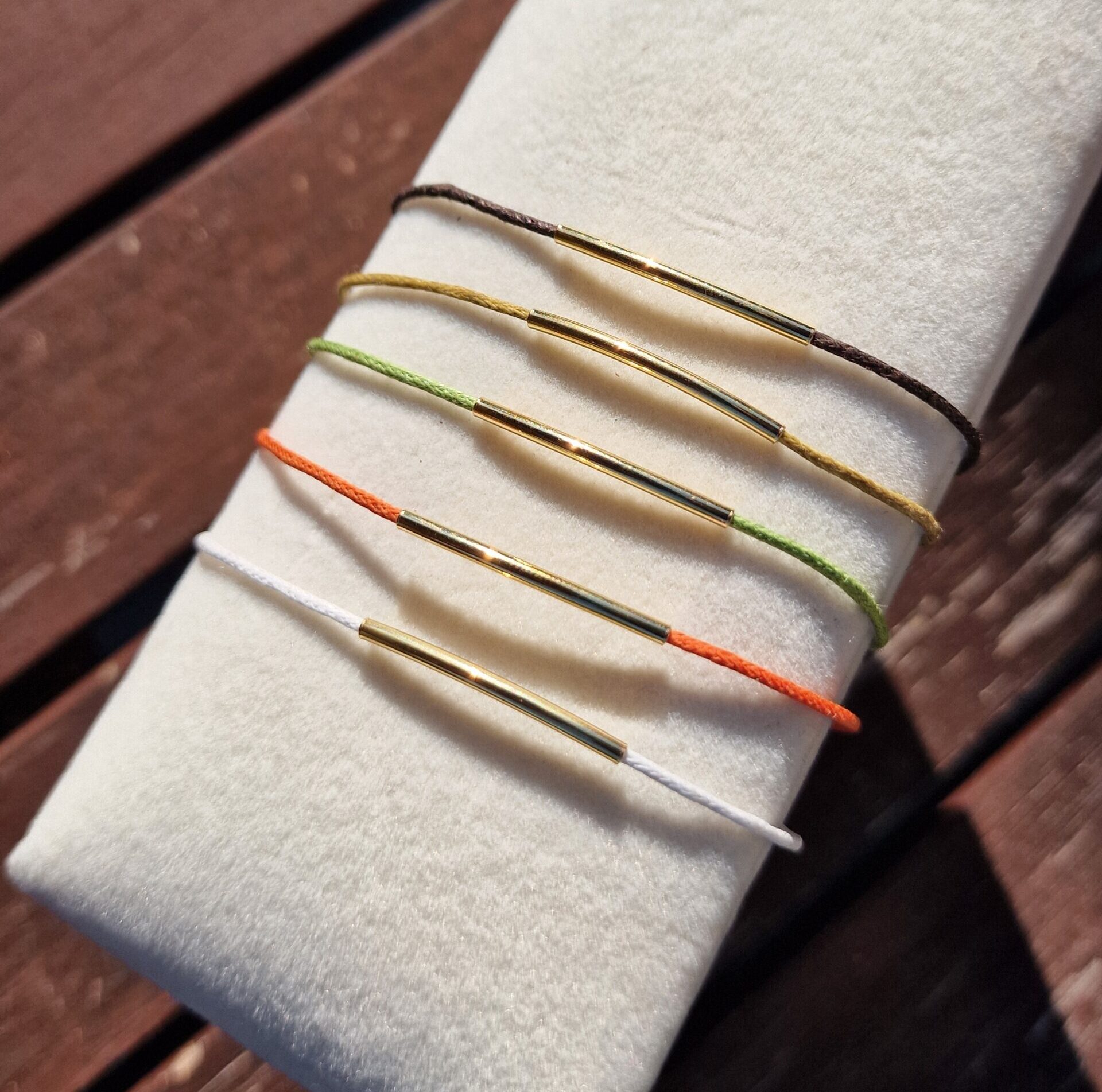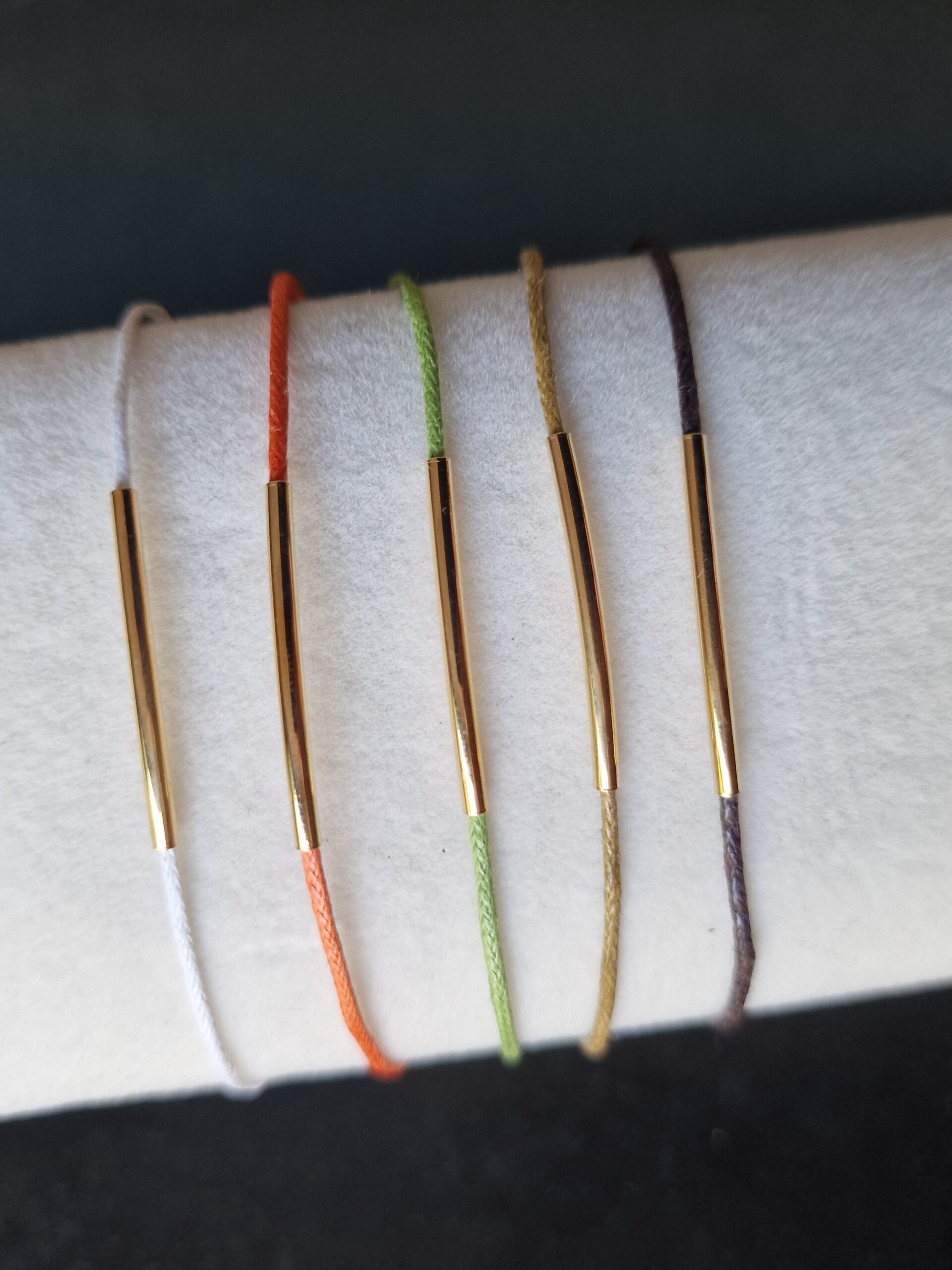 Bracelet Filo D’Oro avec tube doré plaqué flash 18k monté sur fil coloré. Disponible en blanc, orange, vert, beige et marron, ajustable via une chaînette de 2,5 cm.