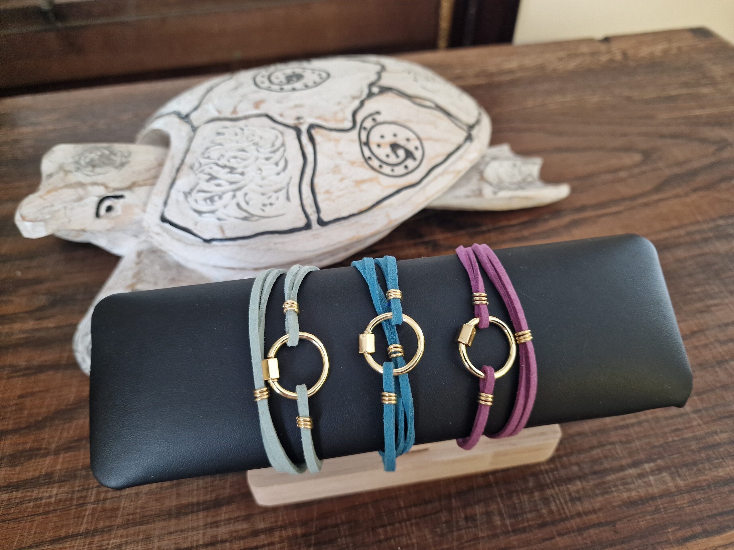 Lacet faux daim 9 anneaux plaqué or 18K (flash) pour bracelet Mousqueton “Cœur ou Cercle”, décliné en 15 couleurs. Sur mesure.