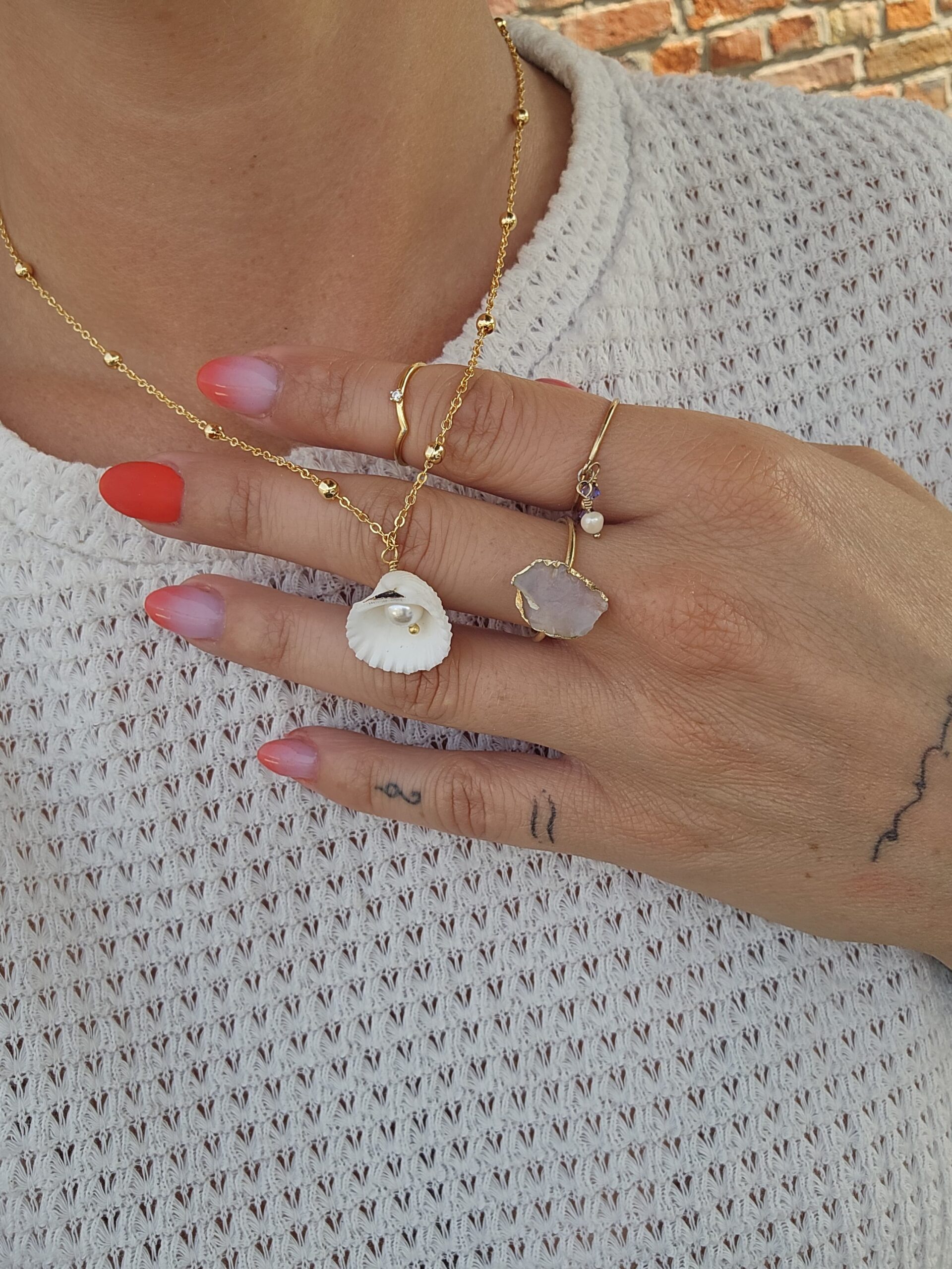 Collier “Perle d’été” chaine perlée en plaqué 18k flash avec coquillage blanc et perle crème