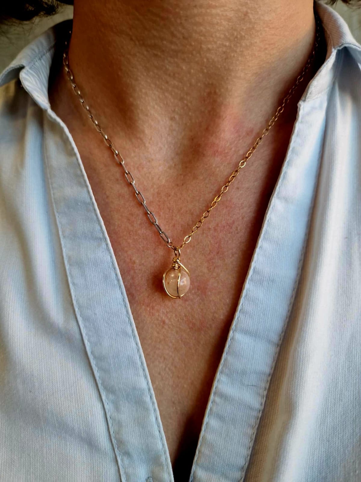 Collier en Gold Filled 14k et argent Sterling 925, orné d’une perle gemme Pierre du Soleil. Un bijou lumineux et raffiné, parfait pour sublimer votre style.