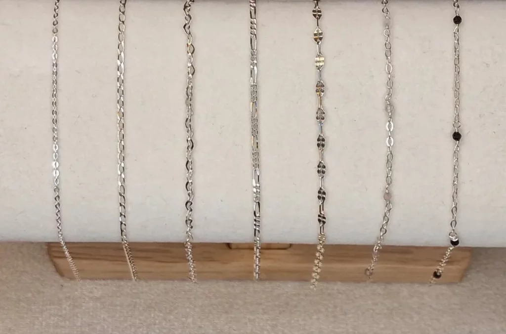 La formule Lilas propose 7 chaînes en argent Sterling 925, parfaites pour créer des bracelets permanents à l’élégance intemporelle.